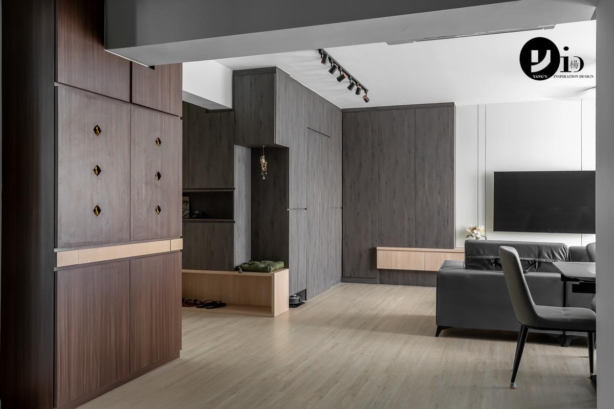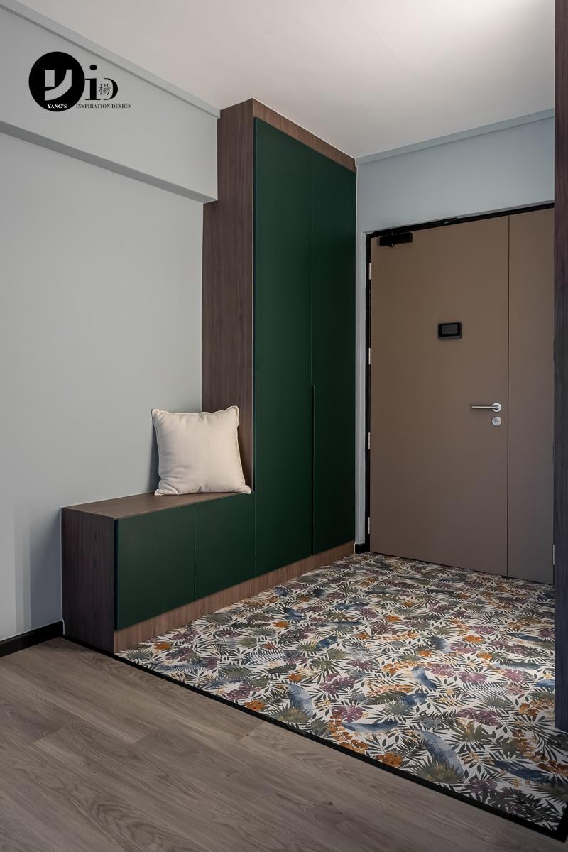 In this HDB foyer, a full-height shoe storage and a bench—the latter crafted from a lighter wood tone for a striking contrast—are the highlights of this space. The use of contrasting wood tones is a theme carried throughout the entire home, lending greater cohesion to the overall design.