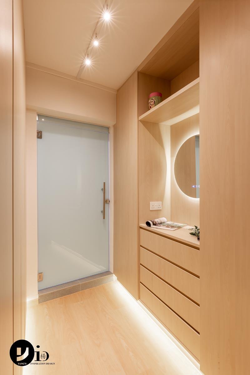 This is the most space-efficient solution for most HDB layouts. The primary challenge is to create a distinct “walk-in” feel that separates your sleeping zone from your dressing zone, without making the entire room feel cramped.